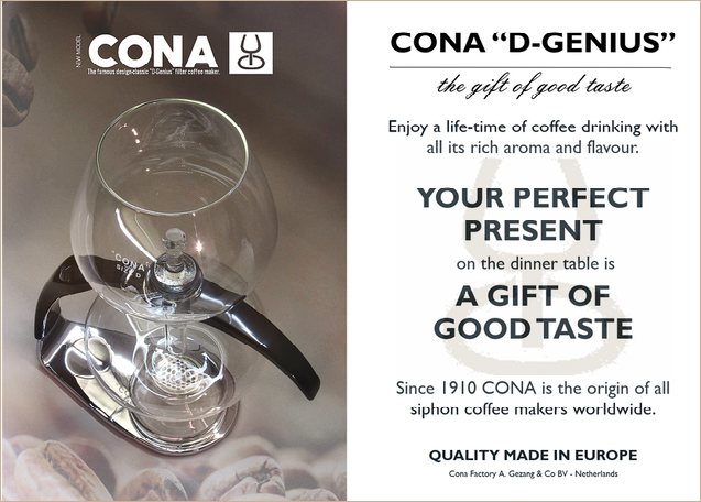 Since 1910, the CONA Coffee Maker has been the original vacuum coffee brewer. With its unique All-Glass brewing method, water and coffee only ever touch glass, ensuring a pure taste without paper or cloth filters. The vacuum principle guarantees the ideal brewing temperature of 94°C – perfect for both coffee and tea.